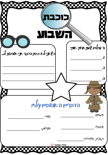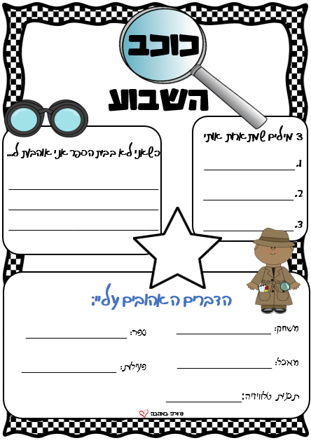 כשהילד כוכב שבוע אפשר לתלות את תמונתו בכיתה וליד את הדף כדי שהחברים יכירו אותו יותר טוב.